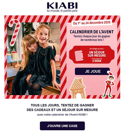 PARTICIPERJouez chaque jour au Calendrier de l'Avent Kiabi pour tenter de gagner un voyage d'une valeur de 3000€, des bons d'achat de 500€... plus de 40 000€ de lots à gagner.